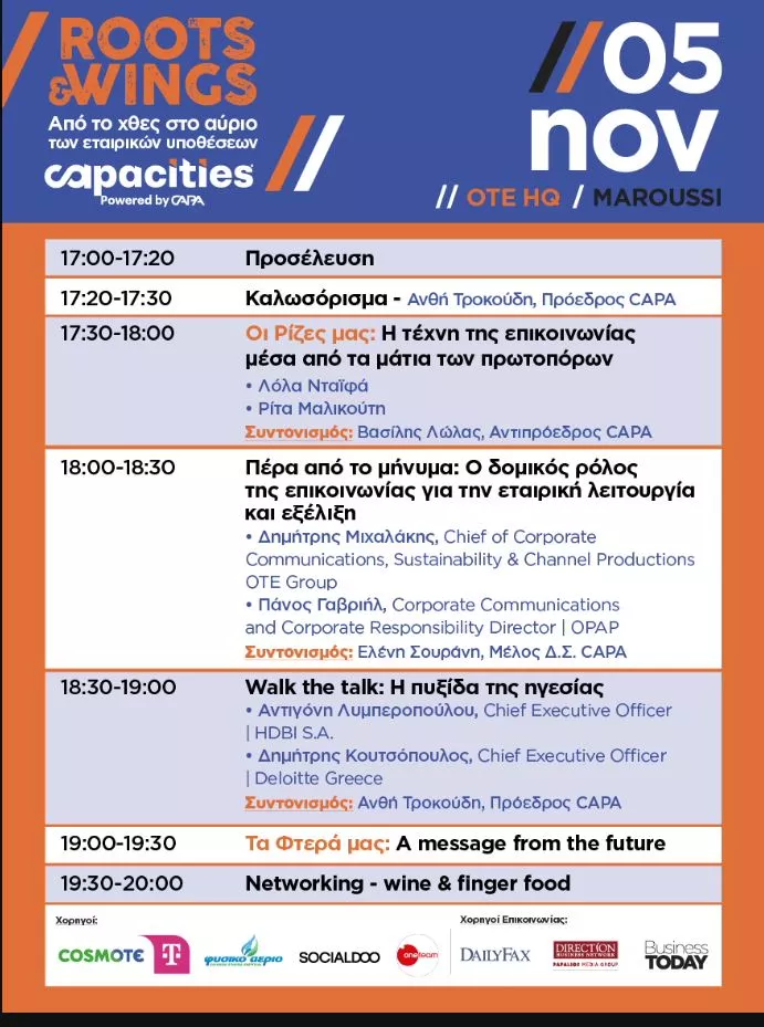 Με το βλέμμα στραμμένο στο μέλλον των Εταιρικών Υποθέσεων, η Ένωση Επαγγελματιών Εταιρικών Υποθέσεων (Corporate Affairs Professional Association – CAPA) διοργανώνει τη δεύτερη εκδήλωση της σειράς capacities powered by CAPA με τίτλο: “Roots & Wings – Από το χθες στο αύριο των εταιρικών υποθέσεων” την Τετάρτη 5 Νοεμβρίου 2025, στο Διοικητικό Μέγαρο του OTE στο Μαρούσι.
