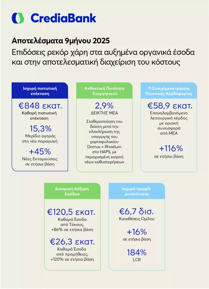 Ενίσχυση σε όλα τα οργανικά μεγέθη του Ομίλου και νέο ρεκόρ επιδόσεων κατέγραψε η CrediaBank παρουσιάζοντας επαναλαμβανόμενα κέρδη (προ φόρων και προβλέψεων) ύψους €58,9 εκατ., αυξημένα κατά 116% σε ετήσια βάση. Τα επαναλαμβανόμενα κέρδη προ φόρων διαμορφώθηκαν στα €40,8 εκατ. για το εννεάμηνο 2025, έναντι μόλις €2,2 εκατ. κατά την αντίστοιχη συγκριτική περίοδο, λόγω της ισχυρής αύξησης των οργανικών εσόδων οδηγούμενα από την πιστωτική επέκταση της Τράπεζας, καθώς και των συνεργειών από τη συγχώνευση με την πρώην Παγκρήτια Τράπεζα.