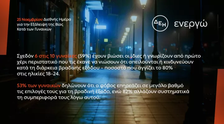 Για πέμπτη συνεχή χρονιά η ΔΕΗ συμμετέχει ενεργά στη Διεθνή Ημέρα για την Εξάλειψη της Έμφυλης Βίας, φωτίζοντας μια καθημερινή και βαθιά ριζωμένη εμπειρία ανασφάλειας, τον φόβο που βιώνουν γυναίκες όλων των ηλικιών κατά τη βραδινή τους έξοδο. Η νέα πανελλαδική έρευνα επιβεβαιώνει ότι για 8 στις 10 γυναίκες η επιστροφή από μια βραδινή έξοδο δεν αποτελεί μια απλή διαδρομή, αλλά μια διαδικασία που συνοδεύεται από φόβο, επιφύλαξη και συστηματικά μέτρα αυτοπροστασίας.