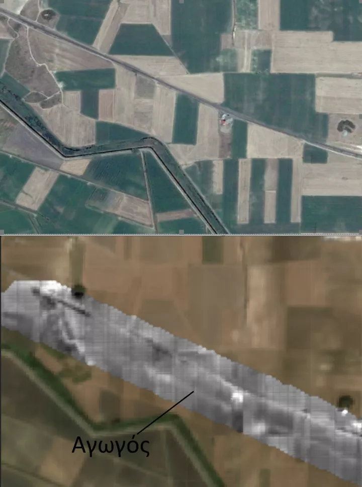 ARAVISSOS_PATENT: Εφαρμογή της μεθοδολογίας στον υπόγειο υδαταγωγό της Αραβησσού: στην επάνω εικόνα η δορυφορική λήψη, στην κάτω, ο συνθετικός χάρτης που αποτυπώνει τις επίμονες χρωματικές μεταβολές του εδάφους κατά μήκος της χάραξης του αγωγού, οι οποίες σχετίζονται με την παρουσία του.