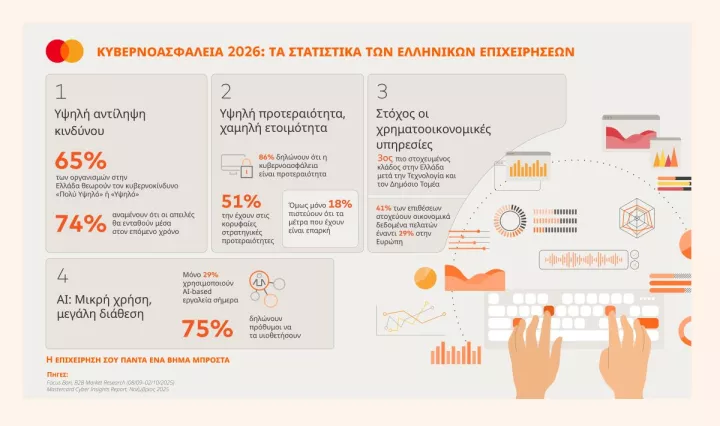 Ο κίνδυνος των κυβερνοεπιθέσεων δεν αποτελεί πλέον θεωρητική απειλή για τις ελληνικές επιχειρήσεις. Σύμφωνα με πρόσφατη έρευνα της Mastercard και της Focus Bari, το 80% των επιχειρήσεων έχει δεχθεί απόπειρα phishing ή scamming το τελευταίο έτος, ενώ το 74% εκτιμά ότι οι απειλές θα ενταθούν περαιτέρω τους επόμενους μήνες.