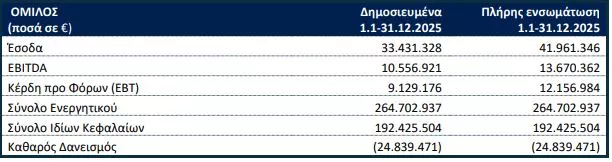 Σημείωση: Τα δημοσιευμένα μεγέθη δεν είναι πλήρως συγκρίσιμα με το 2024, λόγω ενσωμάτωσης των ασφαλιστικών δραστηριοτήτων από τον Απρίλιο 2025. Για την πληρέστερη απεικόνιση της επίδρασης των εξαγορών, παρατίθενται τα βασικά ενοποιημένα μεγέθη ενσωματώνοντας το σύνολο της χρήσης 2025 για τις ασφαλιστικές δραστηριότητες (01.01–31.12.2025):