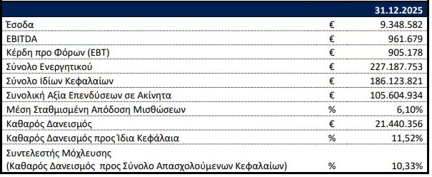 Το EBITDA διαμορφώθηκε σε €0,96 εκατ. από € 0,51εκατ.το 2024(συνεχιζόμενες δραστηριότητες) και τα κέρδη προ φόρων ανήλθαν σε €0,82 εκατ. έναντι €10,21 το 2024. Σημειώνεται ότι τα αποτελέσματα του 2024 είχαν ενισχυθεί από σημαντικά μη επαναλαμβανόμενα κέρδη που προέκυψαν από αναπροσαρμογή επενδυτικών ακινήτων, γεγονός που επηρεάζει τη συγκρισιμότητα των μεγεθών.