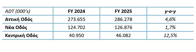 Όσον αφορά τους αυτοκινητόδρομους της Νέας και της Κεντρικής Οδού, η μέση ημερήσια κίνηση για το 2025 παρουσίασε ετήσια αύξηση κατά 1,7% και 12,5% αντίστοιχα, με τον μέσο ημερήσιο αριθμό διελεύσεων (ADT) να διαμορφώνεται σε 126.876 και 46.082 αντίστοιχα. Σημειώνεται ότι η ημερήσια κυκλοφορία στους δυο αυτοκινητόδρομους κατά τον μήνα Δεκέμβριο επηρεάστηκε άμεσα από τις κινητοποιήσεις των αγροτών, οι οποίες συνεχίζονται.