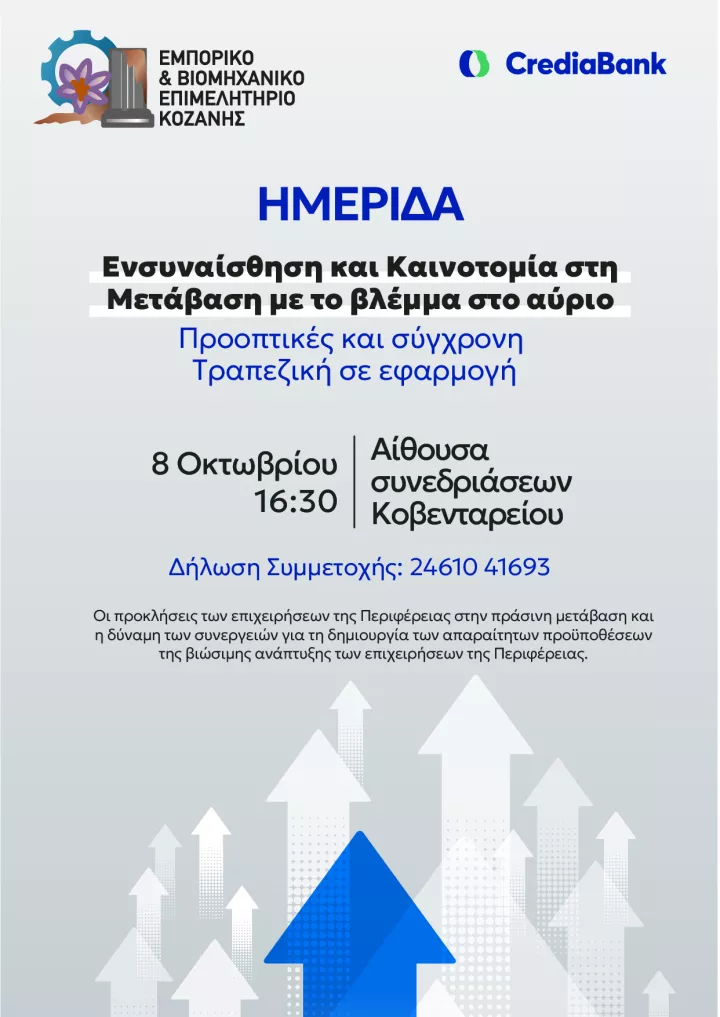 Η CrediaBank, στο πλαίσιο της δέσμευσης της στη βιώσιμη επιχειρηματικότητα, στηρίζει την Ημερίδα που διοργανώνει το Εμπορικό & Βιομηχανικό Επιμελητήριο Κοζάνης, με θέμα «Ενσυναίσθηση και Καινοτομία στη Μετάβαση με το βλέμμα στο αύριο: Προοπτικές και σύγχρονη Τραπεζική σε εφαρμογή», την Τετάρτη 8 Οκτωβρίου, στις 16:30, στην Αίθουσα Συνεδριάσεων του Δημοτικού Συμβουλίου Κοζάνης στο «Κοβεντάρειο» κτίριο (Μούκα 1-7, Κοζάνη).