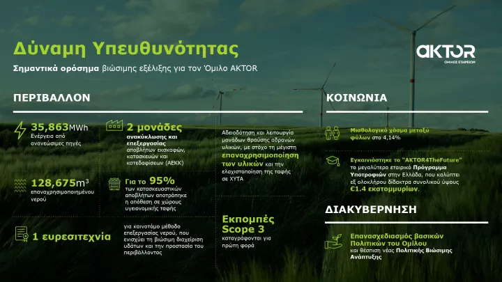 Την στρατηγική του αυτή τοποθέτηση επιβεβαιώνει η Έκθεση Βιωσιμότητας του Ομίλου AKTOR για το οικονομικό έτος 2024, η οποία είναι η πρώτη στην ιστορία του Ομίλου που είναι πλήρως εναρμονισμένη με τις ευρωπαϊκές οδηγίες CSRD και τα πρότυπα ESRS και, μάλιστα, ενσωματώνει την ΑΚΤΩΡ ΑΤΕ, την οποία εξαγόρασε στα τέλη του 2023.