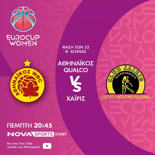 20:45 EuroCup γυναικών – Φάση των «32»-2ος αγώνας: Αθηναϊκός Qualco-Χαϊρίς Novasports Start & YouTube σε περιγραφή του Τάσου Μπαϊρακτάρη και ρεπορτάζ του Αποστόλη Κορτιάνου