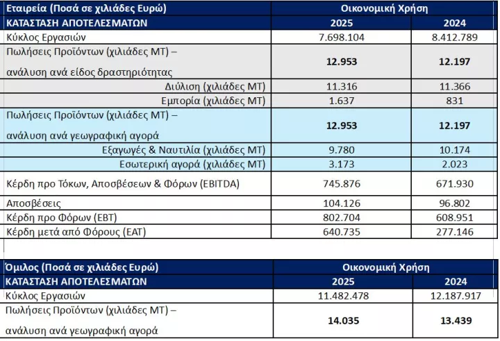 Ο όγκος πωλήσεων προϊόντων σε επίπεδο ομίλου ανήλθε σε ΜΤ 14.035 χιλ. το 2025 έναντι ΜΤ 13.439 χιλ. το 2024 (αύξηση κατά 4,43%). Η πτώση του ενοποιημένου κύκλου εργασιών (κατά 5,79%) τη χρήση 2025 σε σχέση με τη χρήση 2024 οφείλεται στους ίδιους παράγοντες που διαμόρφωσαν την εξέλιξη του κύκλου εργασιών της μητρικής Εταιρείας.
