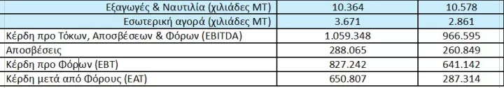 Τα ενοποιημένα EBITDA τη χρήση 2025 διαμορφώθηκαν σε Ευρώ 1.059,3 εκατ. έναντι Ευρώ 966,6 εκατ. το 2024, με τη συμβολή των δύο θυγατρικών Ομίλων που δραστηριοποιούνται στη λιανική αγορά υγρών καυσίμων (CORAL, AVIN) να ανέρχεται σε Ευρώ 119 εκατ., της θυγατρικής MORE ENERGY ΜΟΝΟΠΡΟΣΩΠΗ Α.Ε. σε Ευρώ 108,2 εκατ., των θυγατρικών που δραστηριοποιούνται στον τομέα της κυκλικής οικονομίας (ΗΛΕΚΤΩΡ, ΘΑΛΗΣ) σε Ευρώ 40,5 εκατ. και της LPC σε Ευρώ 9,2 εκατ.