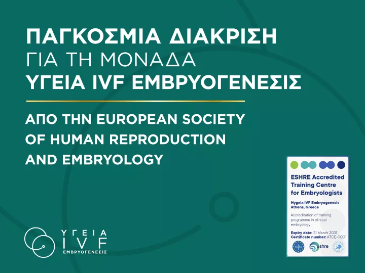 Η πρότυπη Μονάδα Υποβοηθούμενης Αναπαραγωγής ΥΓΕΙΑ IVF Εμβρυογένεσις, η μεγαλύτερη και πλέον σύγχρονη Μονάδα στην Ελλάδα και μέλος του Hellenic Healthcare Group, κατακτά μια σημαντική διεθνή διάκριση - μια παγκόσμια πρωτιά. Το Εμβρυολογικό Εργαστήριο της Μονάδας γίνεται επισήμως το πρώτο εργαστήριο παγκοσμίως που λαμβάνει πιστοποίηση από την European Society of Human Reproduction and Embryology (ESHRE) — τον κορυφαίο ευρωπαϊκό επιστημονικό οργανισμό στον τομέα της αναπαραγωγικής ιατρικής και εμβρυολογίας — ως διαπιστευμένο Κέντρο Εκπαίδευσης στην Κλινική Εμβρυολογία.
