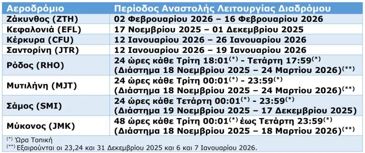 Συγκεκριμένα, οι ημερομηνίες για την αναστολή λειτουργίας των διαδρόμων, ανά αεροδρόμιο, παρουσιάζονται στον παρακάτω Πίνακα: