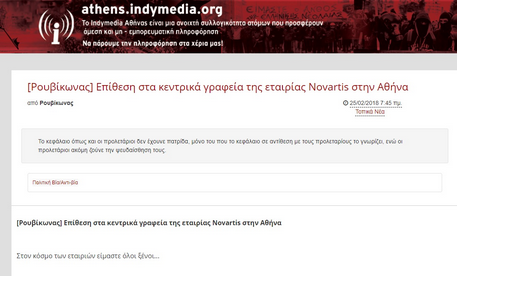 Την ευθύνη για την επίθεση στα στα κεντρικά γραφεία της Novartis Hellas στη Μεταμόρφωση στις 5 τα ξημερώματα, ανέλαβε η αναρχική οργάνωση Ρουβίκωνας με ανάρτησή της σε ιστότοπο του αντιεξουσιαστικού χώρου.