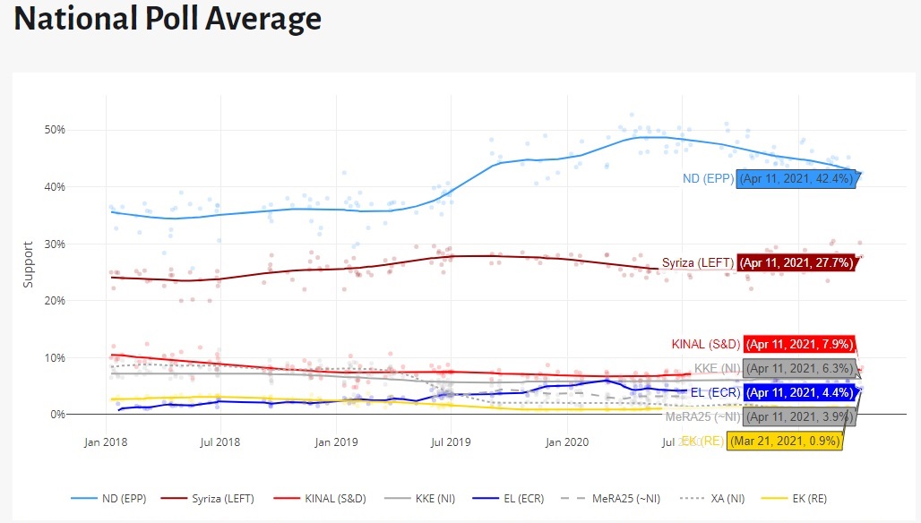 Το μέσο όρο των μέχρι στιγμής δημοσκοπήσεων που έχουν δει το φως της δημοσιότητας για τα πολιτικά κόμματα της Ελλάδας παρουσιάζει ο Οργανισμός Europe Elects, ο οποίος καταγράφει τη ΝΔ να βρίσκεται στο 42,4% και ο ΣΥΡΙΖΑ στο 27,7%, και να έπονται το ΚΙΝΑΛ με 7,9%, το ΚΚΕ με 6,3%, η Ελληνική Λύση ,με 4,4% και το ΜέΡΑ25 με 3,9%.