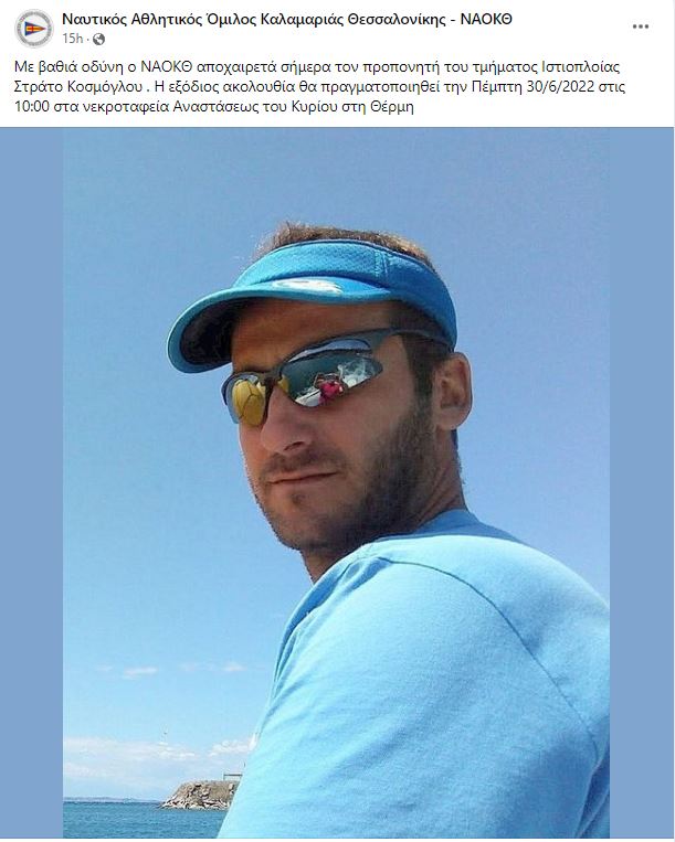 «Με βαθιά οδύνη ο ΝΑΟΚΘ αποχαιρετά σήμερα τον προπονητή του τμήματος Ιστιοπλοίας Στράτο Κοσμόγλου. Η εξόδιος ακολουθία θα πραγματοποιηθεί την Πέμπτη 30/6/2022 στις 10:00 στα νεκροταφεία Αναστάσεως του Κυρίου στη Θέρμη».