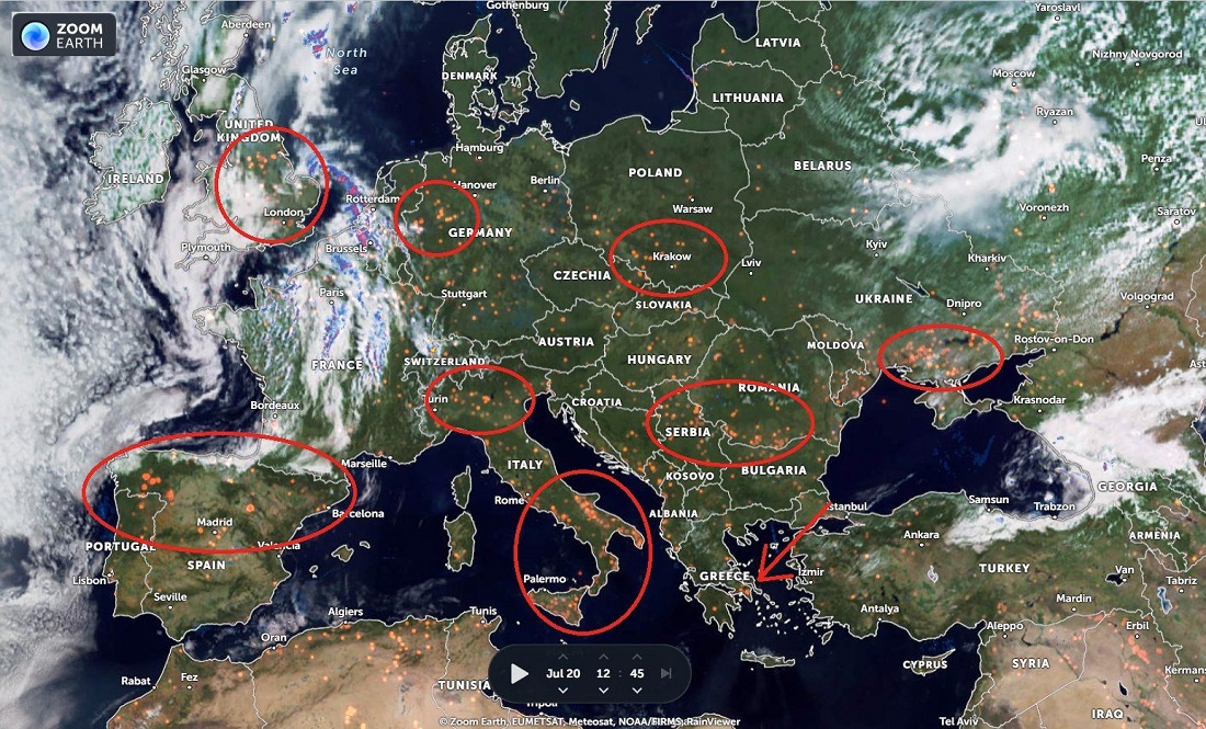 Την πύρινη λαίλαπα που αντιμετωπίζουν όλα τα κράτη της Ευρώπης, αποτυπώνει χάρτης της NASA. Με τις θερμοκρασίες να έχουν εκτοξευθεί πάνω από τους 38 βαθμούς Κελσίου, καταρρίπτοντας κάθε ρεκόρ στις βόρειες χώρες, πυροδοτούν τεράστιες πυρκαγιές που έχουν αναγκάσει δεκάδες χιλιάδες να εγκαταλείψουν τα σπίτια τους.