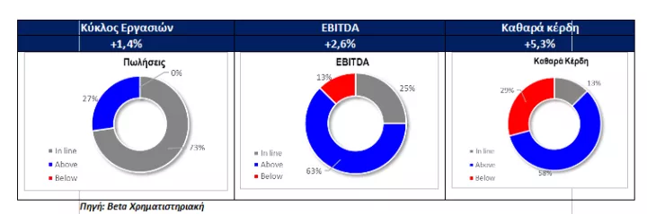 Σε σχέση με τις προσδοκίες της αγοράς το δείγμα των δεικτοβαρών εταιριών που καλύπτεται από ανάλυση ξεπέρασε τα αναμενόμενα. Οι πωλήσεις ήταν καλύτερες κατά 1,5%, η λειτουργική κερδοφορία εμφανίστηκε αυξημένη κατά 2,7% ενώ τα καθαρά κέρδη είναι αυξημένα κατά 5,7%. Η εικόνα είναι πολύ καλύτερη από το α’ τρίμηνο όταν τα αντίστοιχα νούμερα των αναλυτών είχαν αποκλίσεις -0,1%, -0,5% και -4,9% αντίστοιχα. Οι εκτιμήσεις αυτές βασίζονται σε προσαρμοσμένα νούμερα, σε αμιγώς δηλαδή επαναλαμβανόμενη λειτουργική βάση.