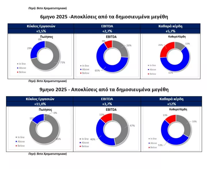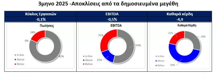 Σε επίπεδο εταιριών, οι πωλήσεις διαμορφώθηκαν κατά 85% σε ευθυγράμμιση με τις εκτιμήσεις και 15% υψηλότερα. Στα λειτουργικά κέρδη (προ προβλέψεων για τις τράπεζες), τα αποτελέσματα ήταν 40% ανώτερα των εκτιμήσεων, 40% σε ευθυγράμμιση και 13% χαμηλότερα. Στα καθαρά κέρδη, 53% των εισηγμένων υπερέβη τις προβλέψεις, 33% κινήθηκαν εντός αυτών και 13% εμφάνισαν αρνητική απόκλιση.