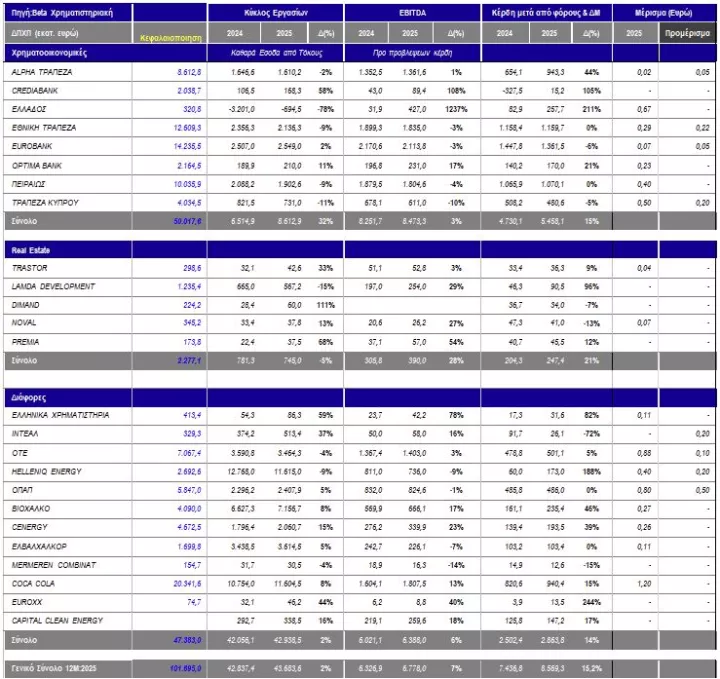 Ως είθισται όσες εταιρίες σπεύδουν να ανακοινώσουν πρώτες τα οικονομικά πεπραγμένα έχουν κάτι καλό να πουν και έτσι το δείγμα περιλαμβάνει μόνο κερδοφόρες εταιρίες. Η συνολική εικόνα είναι αισιόδοξη καθώς ο κύκλος εργασιών παρουσιάζει αύξηση 2% (ανάλογη με το ΑΕΠ του 2025) στα 43,7 δις ευρώ, τα λειτουργικά κέρδη είναι αυξημένα κατά 7,1% στα 6,8 δις ευρώ και τα καθαρά κέρδη είναι αυξημένα κατά 15,2% στα 8,6 δις ευρώ. Πρόκειται για ρυθμούς που αύξησης που για το αντίστοιχο πλήθος εταιριών στο εξάμηνο είναι καλύτεροι και μάλιστα με μεγάλη διαφορά στα καθαρά κέρδη: Ο κύκλος εργασιών στο πρώτο μισό της χρονιάς είχε μηδενική μεταβολή, τα λειτουργικά κέρδη είχαν τον ίδιο ρυθμό μεταβολής (7%) ενώ η καθαρή κερδοφορία ήταν στο +5%. Εκ πρώτης όψεως φαίνεται ότι το δεύτερο εξάμηνο είχαμε μια πιο δυνατή περίοδο ζήτησης.