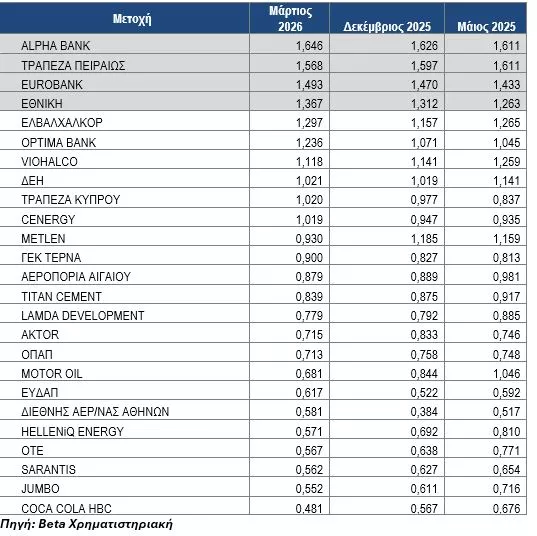 Στον αντίποδα οι τέσσερις συστημικές τράπεζες διατηρούν την επιθετικότερη συμπεριφορά με Beta που ξεκινούν από το 1,37 και καταλήγουν στο 1,65. Οι μετοχές της Elvalhalkor (1,3) και Viohalco (1,1) ακολουθούν με αισθητά βελτιωμένη συμπεριφορά έναντι του παρελθόντος. Το ίδιο συμβαίνει και με την Optima Bank η οποία αν και έχει μικρή σχετικά χρηματιστηριακή ιστορία έχει βρεθεί ψηλά στην θέση του πίνακα (1,24). Τέλος ανάλογη εικόνα με αυτή της αγοράς έχουν οι Cenergy, ΔΕΗ και Τράπεζα Κύπρου.