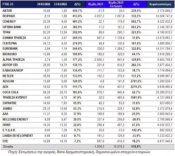 Αναμφίβολα, ο παράγοντας που διαδραμάτισε καθοριστικό ρόλο ήταν η σημαντική αύξηση της κερδοφορίας των εισηγμένων εταιρειών, σε συνδυασμό με τα διαδοχικά ρεκόρ επιδόσεων, τα οποία συνοδεύτηκαν από αντίστοιχες θετικές αναθεωρήσεις τιμών-στόχων. Οι εταιρείες του FTSE-25, που διαμορφώνουν σε μεγάλο βαθμό την τάση και το κλίμα της αγοράς, εισήλθαν στην περίοδο της ουκρανικής κρίσης με συνολικές ζημίες €1,5 δισ., λόγω των αυξημένων προβλέψεων των τραπεζών για τη συμμετοχή τους στο πρόγραμμα κρατικών εγγυήσεων «Ηρακλής», εξέλιξη η οποία ήταν ήδη γνωστή από τα μέσα του 2021.