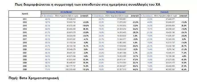 Υπενθυμίζεται ότι τον Ιανουάριο η συμμετοχή των ξένων επενδυτών είχε αγγίξει το ιστορικό υψηλό του 73,8%, όταν για το σύνολο του 2025 είχε διαμορφωθεί στο 64,3%. Ωστόσο, η ουσιαστική διαφορά σε σχέση με πέρυσι εντοπίζεται στη σημαντική αύξηση των συναλλαγών, καθώς ο μέσος ημερήσιος τζίρος έχει ενισχυθεί κατά 81% από την αρχή του έτους.