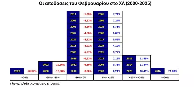 Τα ενθαρρυντικά στοιχεία συνεχίζονται και για τον μήνα που ακολουθεί. Ο Φεβρουάριος εμφανίζεται πλειοψηφικά ανοδικός και, όταν ακολουθεί έναν θετικό Ιανουάριο, παρουσιάζει θετική στατιστική συμπεριφορά σε ποσοστό περίπου 67%. Ωστόσο, όσο χρήσιμα κι αν είναι τα ιστορικά δεδομένα, οι αποδόσεις του παρελθόντος δεν εγγυώνται τις μελλοντικές. Η ανάλυση αυτή βασίζεται αποκλειστικά στην επανάληψη ορισμένων μοτίβων που κατά καιρούς υιοθετεί η αγορά, πάντα στο πλαίσιο πιθανοτήτων και όχι βεβαιοτήτων.