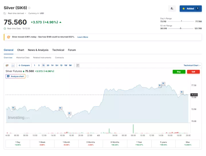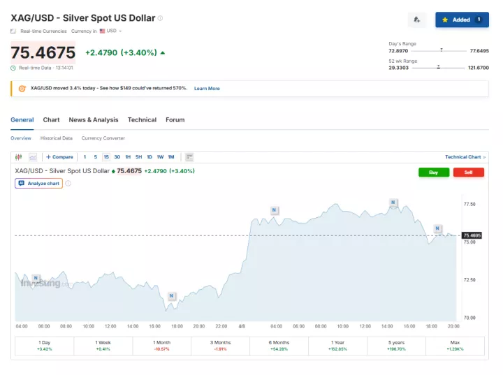 Τα futures του ασημιού - παράδοσης Μαΐου - ισχυροποιούνταν 3,45% στα 74,47 δολάρια ανά ουγγιά.