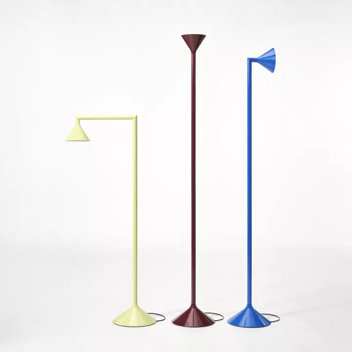 Ο Ολλανδός σχεδιαστής Lex Pott αναρωτήθηκε τι συμβαίνει όταν κόβεις έναν χαλύβδινο κύλινδρο στις 45 μοίρες και αρχίζεις να περιστρέφεις τα κομμάτια. Δύο λοξές τομές μετατρέπουν ένα φωτιστικό δαπέδου σε ένα πιο ευέλικτο αντικείμενο: περιστρέφοντάς το προς μία κατεύθυνση γίνεται προβολέας, προς άλλη κατεύθυνση γίνεται φωτιστικό ανάγνωσης, ενώ σε τρίτη δημιουργεί έμμεσο φωτισμό προς τα πάνω - κάθε επιλογή δημιουργεί διαφορετική ατμόσφαιρα στον ίδιο χώρο. Η λειτουργία έχει εμπνευστεί από τη γεωμετρία, και η παιχνιδιάρικη κίνηση της περιστροφής μεταμορφώνει το φωτιστικό κάθε φορά. Το κατοχυρωμένο σχέδιο διαθέτει καπέλο σε μορφή τρομπέτας και λεπτό μεταλλικό κορμό που αναδύεται από μια φαρδιά βάση σε σχήμα κώνου, διαθέσιμο σε 3 αποχρώσεις.