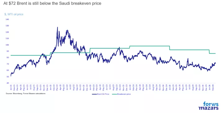 - Η Σαουδική Αραβία δείχνει διατεθειμένη να αποδεχτεί χαμηλότερες τιμές πετρελαίου εδώ και καιρό, πιθανώς σε ανταλλαγή για καλύτερη πρόσβαση στις δυτικές αγορές. Η ενδεχόμενη κατάρρευση του ιρανικού καθεστώτος (με το οποίο έχει μακρόχρονη αντιπαράθεση και διεξάγει πόλεμο διαμεσολάβησης στην Υεμένη) δεν αποτελεί καταλύτη για αλλαγή αυτής της στάσης. Αντίθετα, θα ήταν στο συμφέρον της Σαουδικής Αραβίας να διασφαλίσει ότι οι αγορές παραμένουν αρκετά ήρεμες ώστε οι ΗΠΑ να ολοκληρώσουν την επιχείρηση.