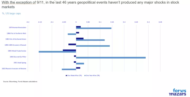 - Ως προς τις χρηματαγορές, όπως και τον Ιούλιο, δεν αναμένουμε ιδιαίτερη αντίδραση. Ιστορικά, τα γεωπολιτικά γεγονότα, ιδίως όταν είναι τοπικά, είχαν μικρή μακροπρόθεσμη επίπτωση στα επικίνδυνα περιουσιακά στοιχεία.