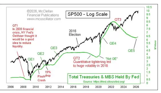 🏦 Αντίστοιχα, το τέλος του QE2 το 2011 συνδέθηκε με πτώση 19%, τραπεζικό στρες και νέα παρέμβαση μέσω Operation Twist και αργότερα QE3. Ακόμη και η πιο ήπια έξοδος από το QE3 προκάλεσε αστάθεια το 2015, ενώ το QT2 του 2018 κατέληξε στη βίαιη διόρθωση του τέταρτου τριμήνου.
