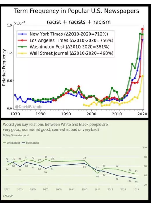 🔍 Το πρώτο γράφημα δείχνει εκρηκτική αύξηση στη χρήση των όρων racist / racism / racists στα μεγάλα αμερικανικά ΜΜΕ την περίοδο 2010-2020. Σε ορισμένες εφημερίδες η αύξηση ξεπέρασε το 700%, κάτι που σημαίνει πως το θέμα κυριάρχησε στον δημόσιο λόγο.