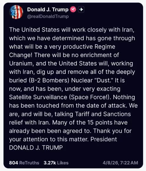 Λάβαμε μια πρόταση 10 σημείων από το Ιράν και πιστεύουμε ότι αποτελεί μια λειτουργική βάση για διαπραγματεύσεις. Σχεδόν όλα τα διάφορα σημεία διαφωνίας του παρελθόντος έχουν συμφωνηθεί μεταξύ των Ηνωμένων Πολιτειών και του Ιράν, αλλά μια περίοδος δύο εβδομάδων θα επιτρέψει την οριστικοποίηση και την ολοκλήρωση της συμφωνίας. Εκ μέρους των Ηνωμένων Πολιτειών της Αμερικής, ως Πρόεδρος, και εκπροσωπώντας επίσης τις χώρες της Μέσης Ανατολής, είναι τιμή μου που αυτό το μακροπρόθεσμο πρόβλημα πλησιάζει στην επίλυσή του. Σας ευχαριστώ για την προσοχή σας σε αυτό το θέμα! Πρόεδρος ΝΤΟΝΑΛΝΤ ΤΡΑΜΠ».
