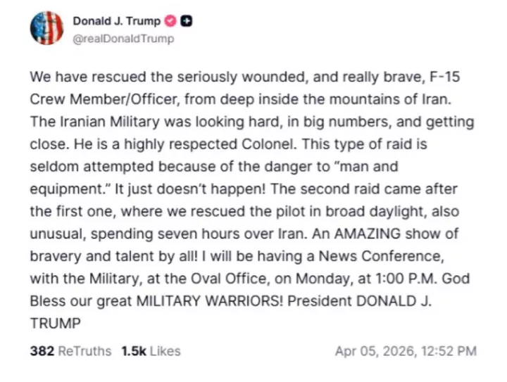 Όπως αναφέρει στην ανάρτησή του ο Αμερικανός πρόεδρος, «τις τελευταίες ώρες, ο αμερικανικός στρατός πραγματοποίησε μία από τις πιο τολμηρές επιχειρήσεις έρευνας και διάσωσης στην ιστορία των Ηνωμένων Πολιτειών, για έναν από τους εξαιρετικούς αξιωματικούς του πληρώματός μας, ο οποίος τυγχάνει να είναι και ένας ιδιαίτερα σεβαστός συνταγματάρχης, και για τον οποίο είμαι ενθουσιασμένος που σας ανακοινώνω ότι είναι πλέον ΑΣΦΑΛΗΣ ΚΑΙ ΥΓΙΗΣ!».
