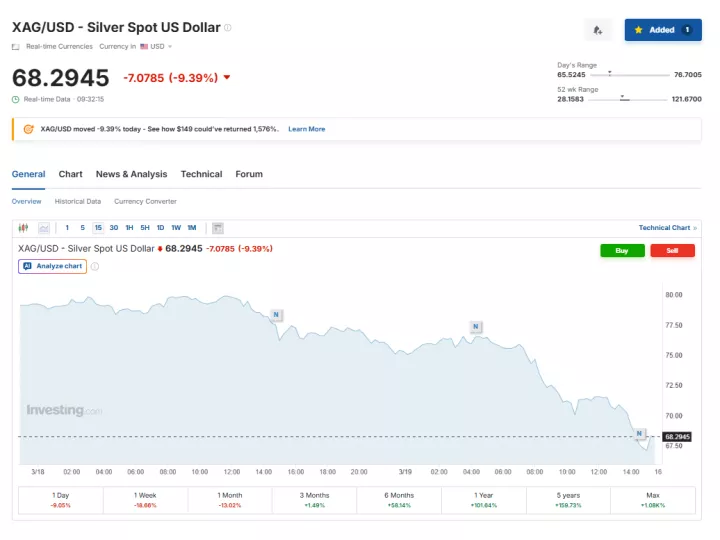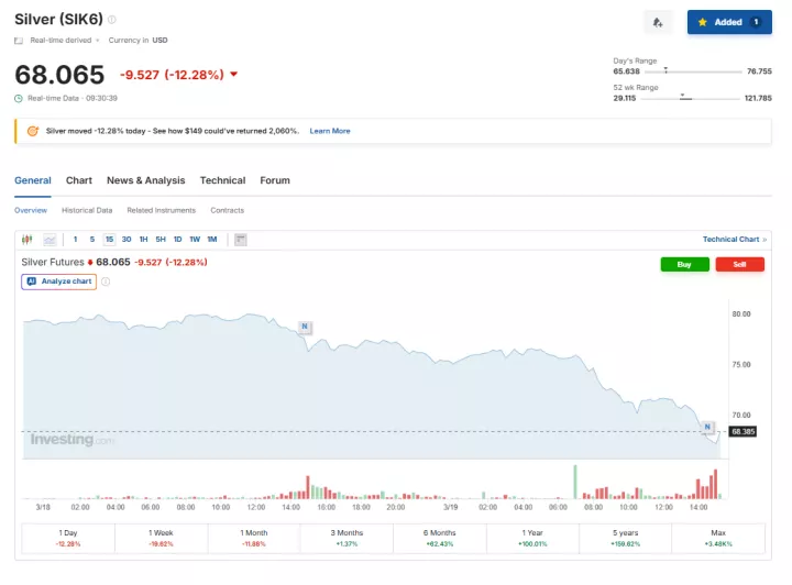 Πιο μεγάλη πτώση παρουσιάζει το ασήμι καθώς τα futures υποχωρούν 12,28% στα 68,06 δολάρια την ουγγιά ενώ στη spot αγορά το ασήμι χάνει 9,36% στα 68,29 δολάρια ανά ουγγιά.