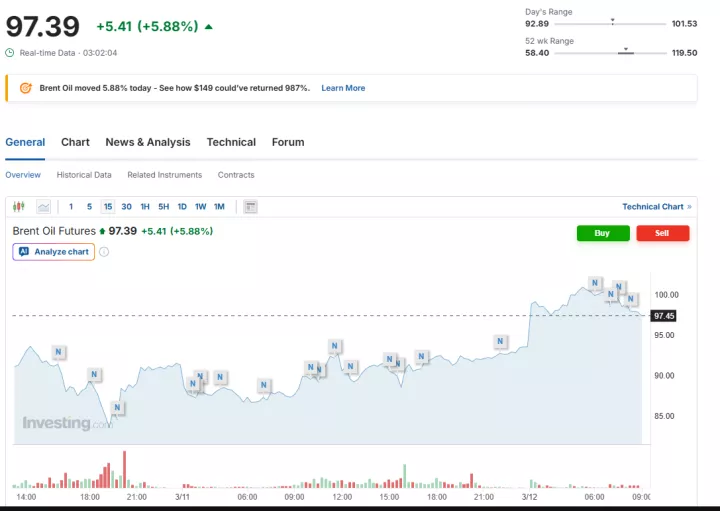 Στις 13:00 ώρα Ελλάδας τα συμβόλαια μελλοντικής εκπλήρωσης του Brent κατέγραφαν άνοδο 6,34% στα 97,81 δολάρια ανά βαρέλι. Παράλληλα, τα συμβόλαια του αμερικανικού αργού West Texas Intermediate ενισχύθηκαν κατά 5,78%, στα 92,43δολάρια ανά βαρέλι.