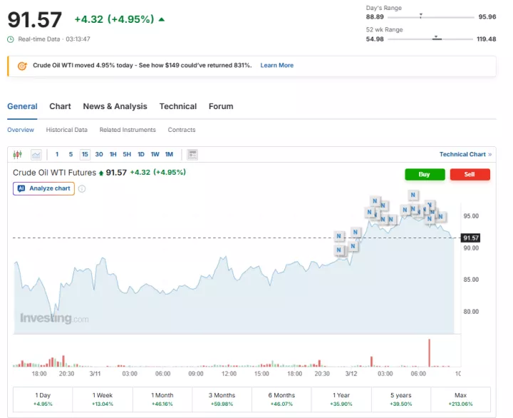Νωρίς το πρωί, τα συμβόλαια μελλοντικής εκπλήρωσης του Brent κατέγραφαν άνοδο σχεδόν 9%, στα 100,23 δολάρια ανά βαρέλι. Παράλληλα, τα συμβόλαια του αμερικανικού αργού West Texas Intermediate ενισχύονταν κατά 8,26%, στα 94,46 δολάρια ανά βαρέλι.