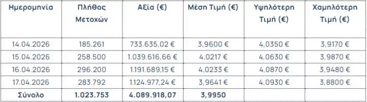 Ειδικότερα, η τράπεζα ανακοίνωσε ότι κατά το διάστημα 14 έως 17 Απριλίου 2026 απέκτησε συνολικά 1.023.753 ίδιες μετοχές, με μέση τιμή κτήσης 3,9950 ευρώ ανά μετοχή και συνολικό κόστος που ανήλθε σε 4.089.918,07 ευρώ.
