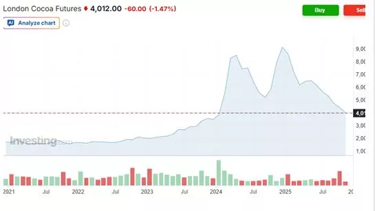Παρά το γεγονός πως η τιμή του κακάο έχει πέσει από τα 9.000 δολ. ο τόνος στα 4.000 δολ. η τιμή παραμένει σχεδόν τριπλάσια από αυτήν πέντε χρόνια νωρίτερα.