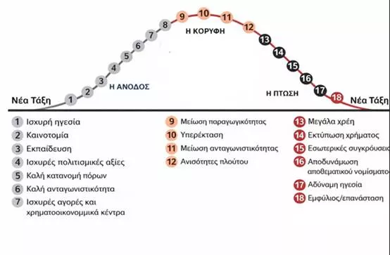 Είναι το σημείο όπου οι κοινωνίες εξακολουθούν να είναι πλούσιες, αλλά χάνουν σταδιακά την αυτοπεποίθηση, την πειθαρχία και το συλλογικό τους όραμα.