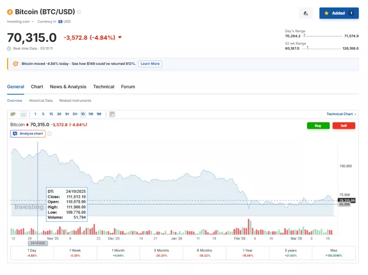 Το Bitcoin σημείωσε απότομη πτώση την Πέμπτη, υποχωρώντας κάτω από τα 71.000 δολάρια, καθώς οι επενδυτές αξιολόγησαν τη «σκληρή» στάση της Federal Reserve σε συνδυασμό με την άνοδο των τιμών του πετρελαίου λόγω της κλιμάκωσης των εντάσεων στη Μέση Ανατολή.