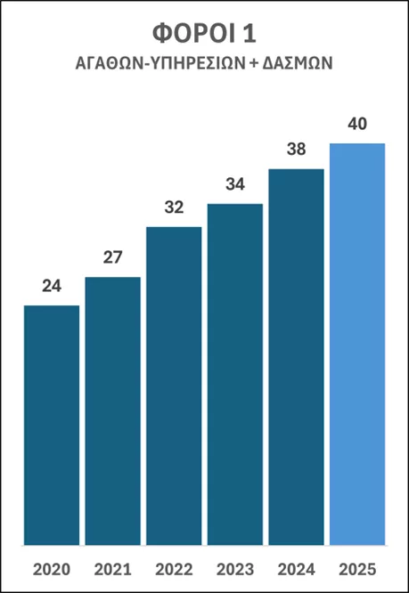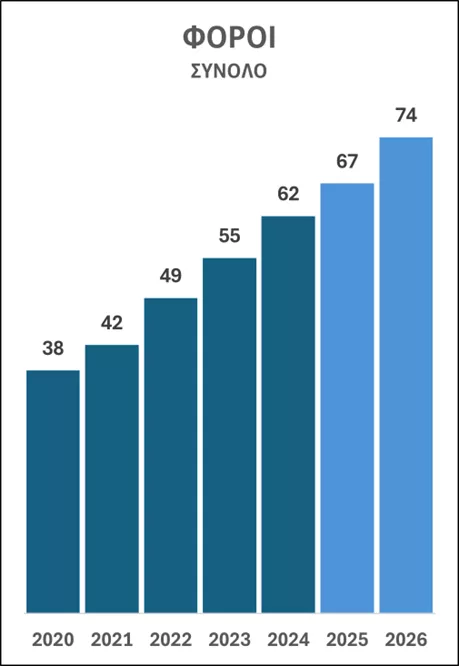 Θυμίζω ότι τα προηγούμενα χρόνια ο ρυθμός αύξησης των φόρων ήταν συνεχώς διψήφιος, με αποτέλεσμα να εκτιμάται ότι το 2026 (έτος για το οποίο οι βουλευτές ψήφισαν 74 δισ. φόρων), θα έχουν διπλασιαστεί έναντι εκείνων του 2020.