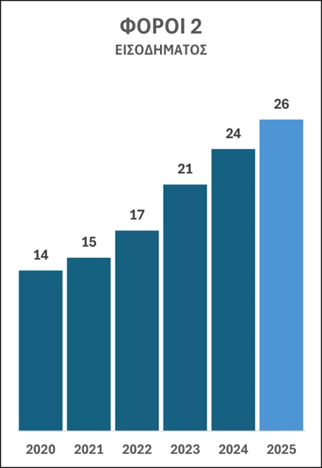Όμως, και η φορολογία επί των εισοδημάτων, οι γνωστοί «άμεσοι», αυξήθηκαν με ετήσιο ρυθμό 10% φθάνοντας τα 26 δισ. ευρώ. Συγκρινόμενοι με εκείνους του 2020, η αύξηση είναι 94%. Σχεδόν διπλασιασμός και σε αυτή την κατηγορία φόρων.