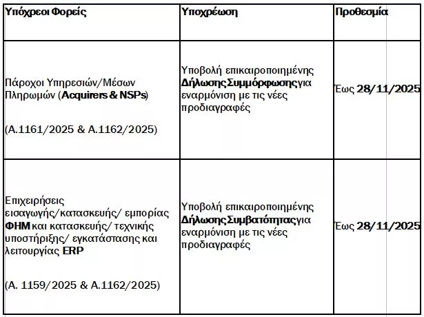 Περαιτέρω, καθορίζονται οι προθεσμίες συμμόρφωσης για τις εταιρείες τεχνολογίας και πληρωμών, ως εξής: