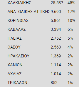 Σχεδόν οι μισές επιταγές ενεργοποιήθηκαν στη Χαλκιδική και ακολούθησαν η Ανατολική Αττική και η Κορινθία με το δεύτερο και τρίτο μεγαλύτερο αριθμό ενεργοποιημένων επιταγών αντίστοιχα.