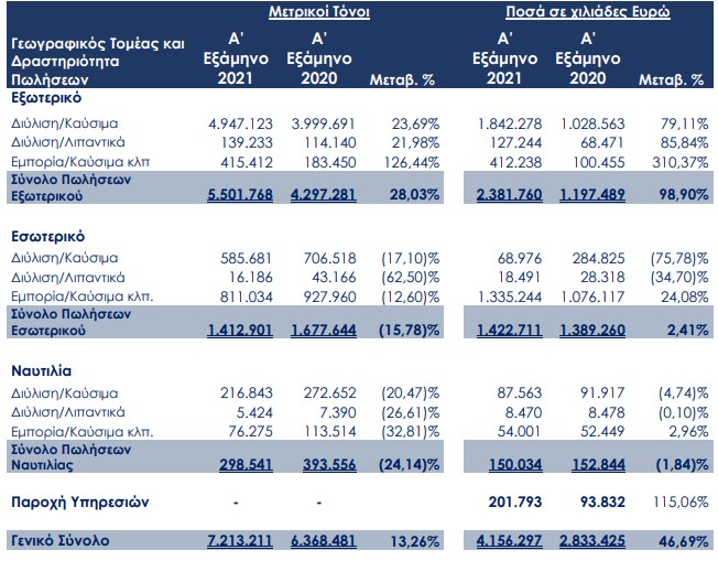 Το Α΄ εξάμηνο του 2021 ο Όμιλος είχε έσοδα από παροχή υπηρεσιών το μεγαλύτερο μέρος των οποίων αφορούσε δραστηριότητες τις NRG Α.Ε και το υπόλοιπο δραστηριότητες της OFC ΥΠΗΡΕΣΙΕΣ ΑΕΡΟΠΟΡΙΚΟΥ ΚΑΥΣΙΜΟΥ A.E καθώς και αποθήκευτρα και σχετιζόμενες υπηρεσίες. Από την ανάλυση των στοιχείων όγκου των ενοποιημένων πωλήσεων προκύπτει ο έντονα εξαγωγικός χαρακτήρας του Ομίλου δεδομένου ότι οι πωλήσεις Εξωτερικού και Ναυτιλίας ανήλθαν το Α’ εξάμηνο 2021 σε 80,41% επί του συνολικού όγκου των πωλήσεων έναντι 73,66% την αντίστοιχη περίοδο του 2020 καθώς και η σημαντική συμμετοχή της βιομηχανικής δραστηριότητας (διαμορφώθηκε σε 81,94% το Α’ εξάμηνο 2021 έναντι 80,77% το Α’ εξάμηνο 2020).