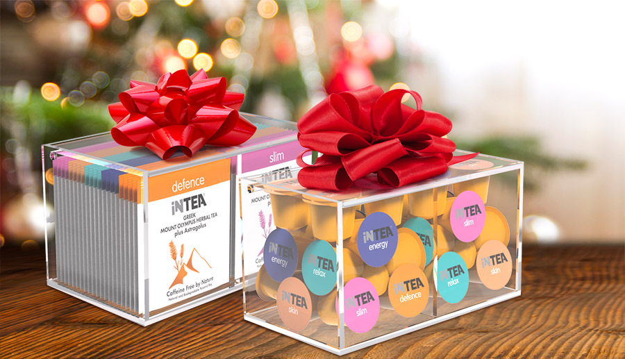 Αυτές τις γιορτές, το ΙNTEA προσφέρει και μια έκπληξη! Την ειδική έκδοση δώρου του διάφανου gift box, μια συλλογή που περιλαμβάνει όλες τις διαθέσιμες λειτουργικότητες του ΙNTEA, δηλαδή Defence, Energy, Relax, Slim και Skin, για να κάνεις ένα πρωτότυπο, αλλά και ωφέλιμο, συνάμα, δώρο.