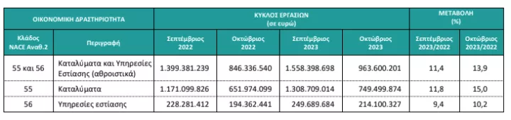 Ειδικότερα, για τις επιχειρήσεις στον κλάδο των Καταλυμάτων, με υποχρέωση τήρησης διπλογραφικών βιβλίων, για τις οποίες υπάρχουν διαθέσιμα στοιχεία σε μηνιαία βάση, ο κύκλος εργασιών τον Οκτώβριο 2023 ανήλθε σε 749.499.874 ευρώ, σημειώνοντας αύξηση 15,0% σε σχέση με τον Οκτώβριο 2022, όπου είχε ανέλθει σε 651.974.099 ευρώ.