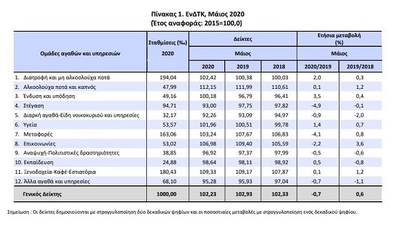 Σε ετήσια σύγκριση (Μάιος 2020 - Μάιο 2019) ξεχωρίζουν οι ανατιμήσεις σε πολλά είδη διατροφής, όπως σε: νωπά φρούτα (28,6%), γιαούρτι (6,9%), αλλαντικά (6,4%), ζυμαρικά (5%), χοιρινό (4,3%), νωπά λαχανικά (4%), γάλα νωπό πλήρες (3,8%) και αρνί- κατσίκι (3,2%). Ανατιμήσεις, κατά 3,4%, υπήρξαν και στην ένδυση- υπόδηση.