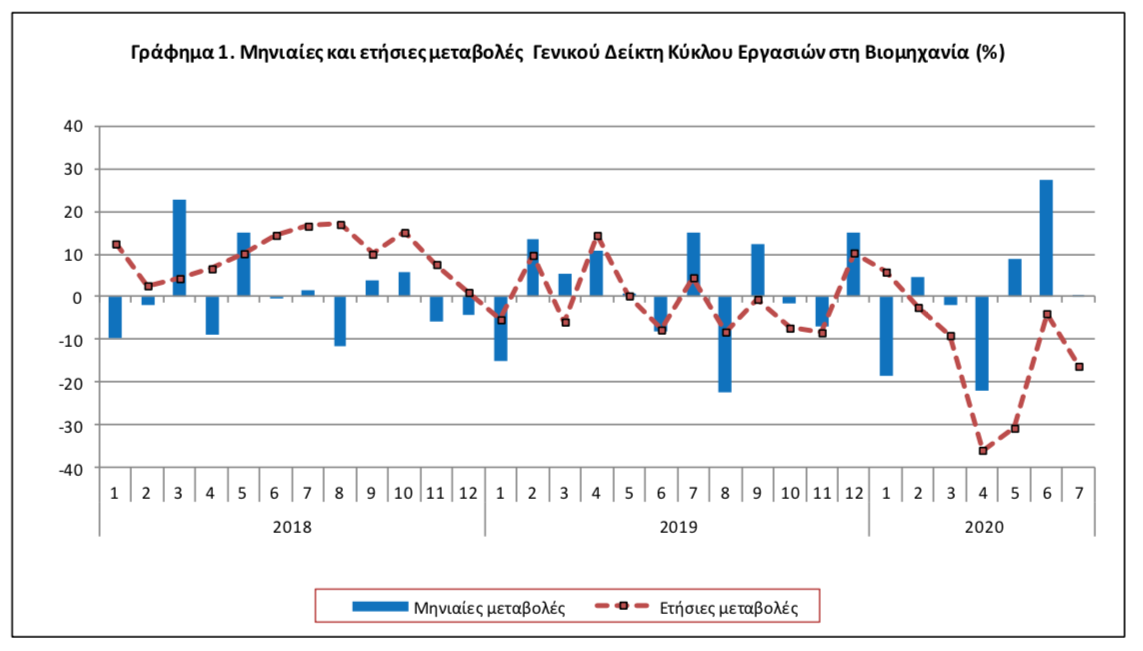 Μείωση 16,2% παρουσίασε ο Γενικός Δείκτης Κύκλου Εργασιών στη Βιομηχανία τον Ιούλιο σε σύγκριση με τον αντίστοιχο δείκτη του Ιουλίου 2019, έναντι αύξησης 4,5% που σημειώθηκε κατά την αντίστοιχη σύγκριση του έτους 2019 με το 2018.
